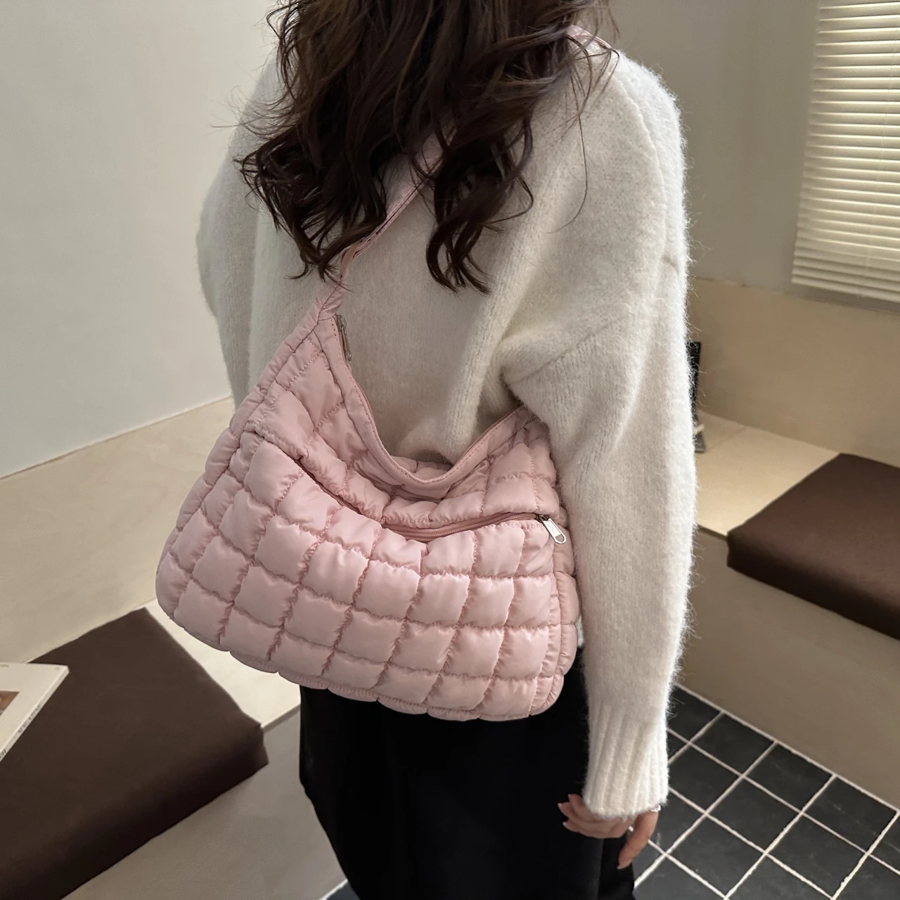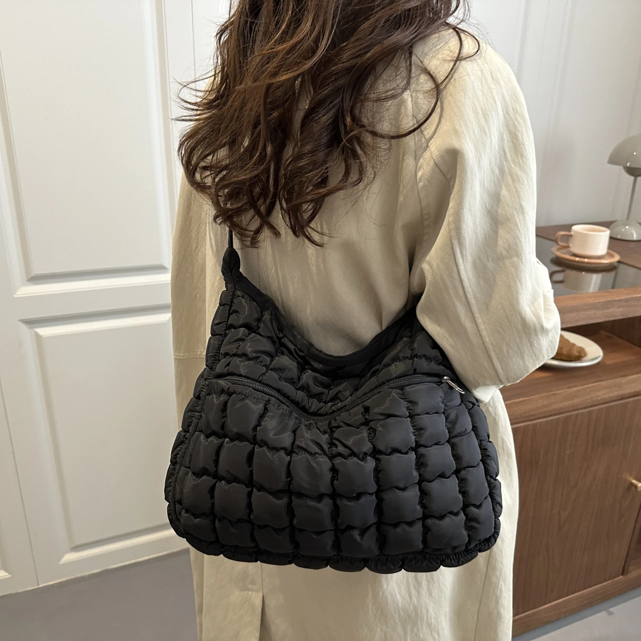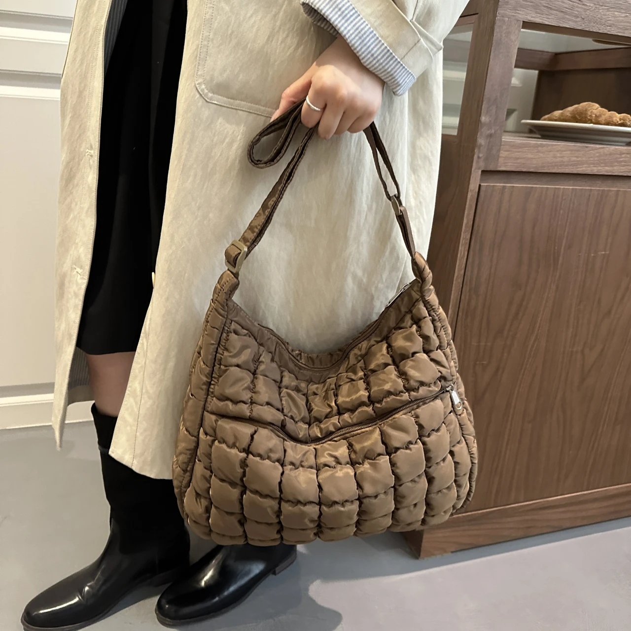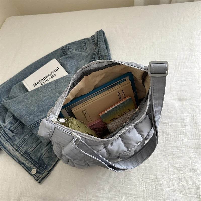 With its quilted puffer design and solid pattern, this bag combines style with functionality.