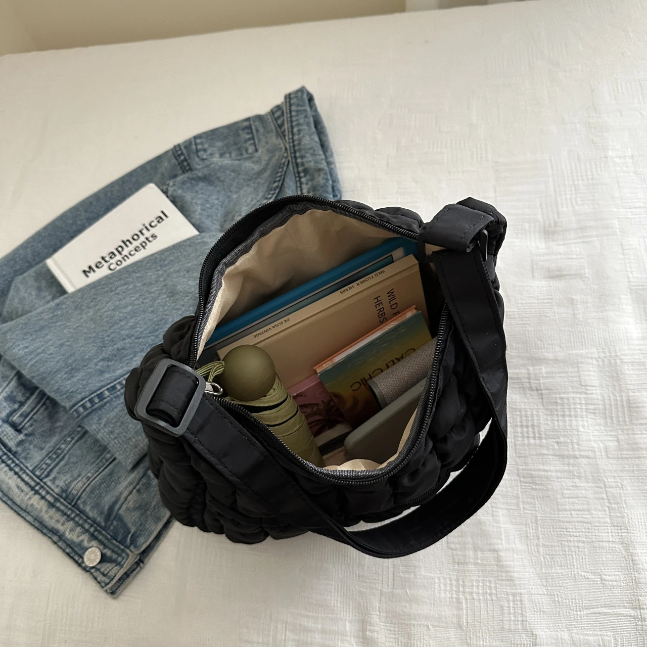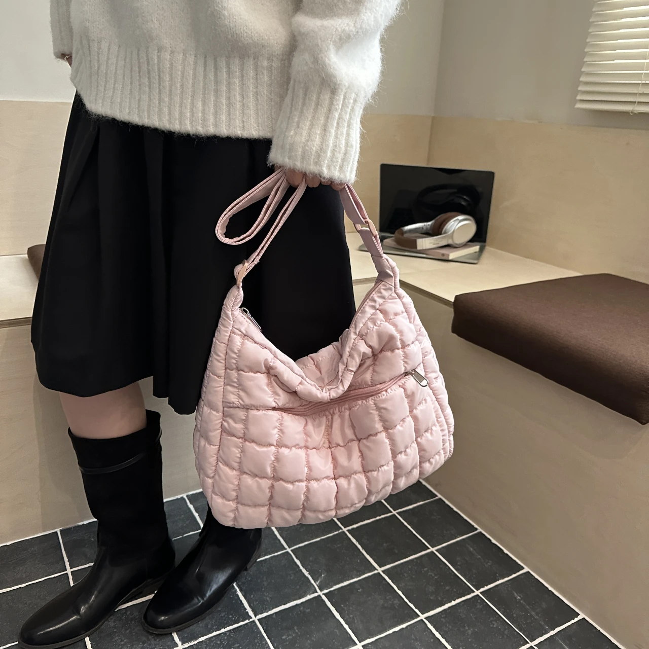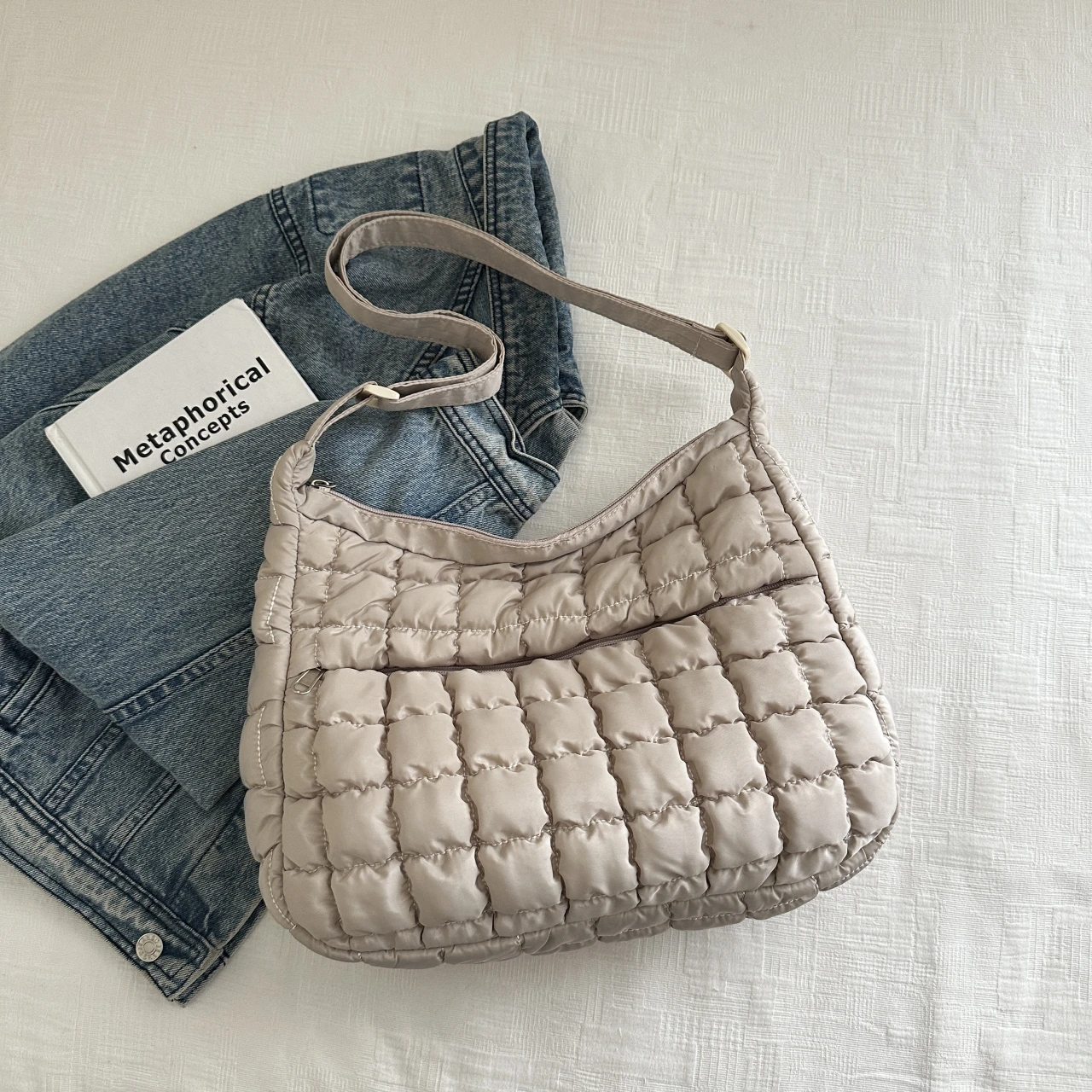 With its quilted puffer design and solid pattern, this bag combines style with functionality.